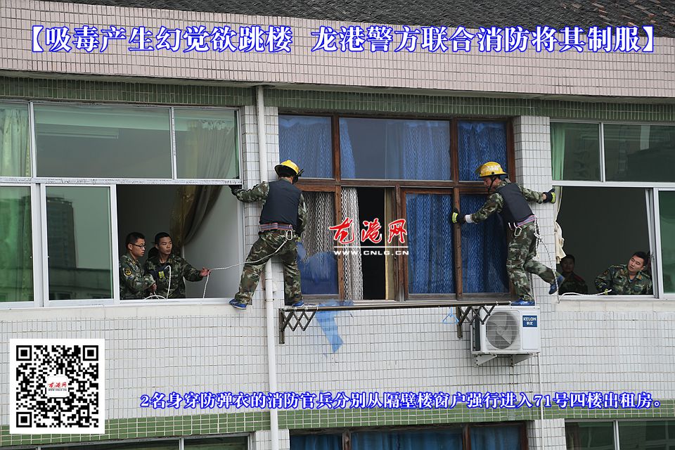 53米的消防登高车、120救护车、观察哨各就各位,2名身穿防弹衣的消防战士在其他消防战士的配合下,悄悄地分别从西一街69号、73号四楼窗户进入71号四楼窗户,果断敲掉2块窗户玻璃冲入,迅速将吸毒男子肖某扑倒制服并押解出出租房。