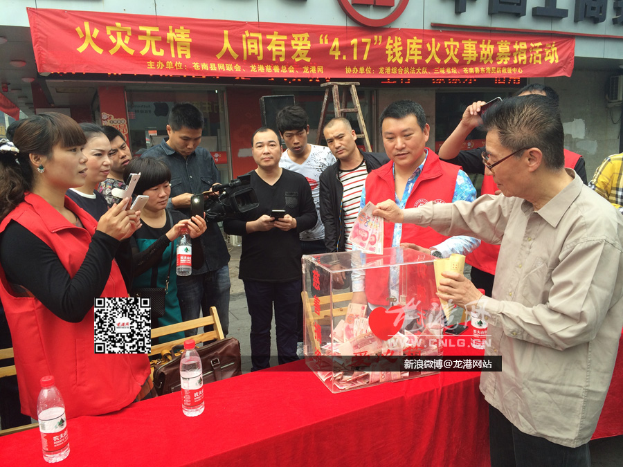 龙港网5月19日快讯(值班编辑陈记)2015年4月19日,由苍南县网络界人士联谊会、龙港镇慈善总会、龙港网主办,龙港镇综合执法大队、三味书坛 、苍南县东海民防救援中心协办的"4.17"钱库火灾事故募捐活动今天上午9点至晚上21点止在龙港镇龙跃路工行门口开展爱心募捐活动,现场共收到捐款141300元。