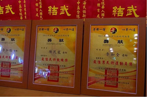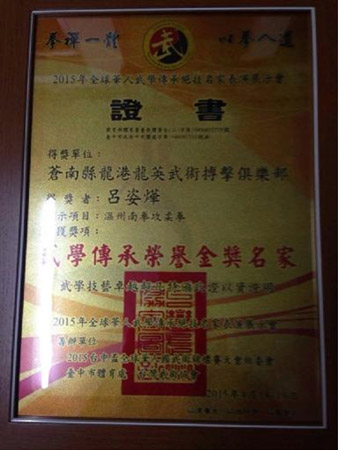 龙港网4月27日讯:日前,龙港龙英武术搏击俱乐部组队参加在台湾举行的2015年“台中杯”全球华人武术锦标赛,赛会上,龙英健儿大展雄风,在所参赛的24个项目上,共获得16金4银3铜以及集体冠军的佳绩,其中俱乐部会长吕姿烨展示的温州南拳功柔法还被授予2015年全球华人武学传承荣誉金奖名家。