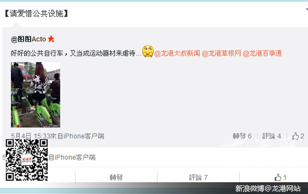 日前,记者在位于龙港双排街百一超市门口的公共自行车站点上看到,一些放学回家的学生们骑在在公共自行车上玩耍,有的坐在锁车桩上,有的坐在车座上,就像在公园的健身器材上“健身”一样蹬着玩,玩的不亦乐乎,浑然不觉自己的这种不文明行为是在破坏公物。而日前,龙港微博网友@图图Acto等网友也发微博晒出了居民把公共自行车当健身器材来用的不文明行为,呼吁大家要爱惜公共设施,文明使用。
