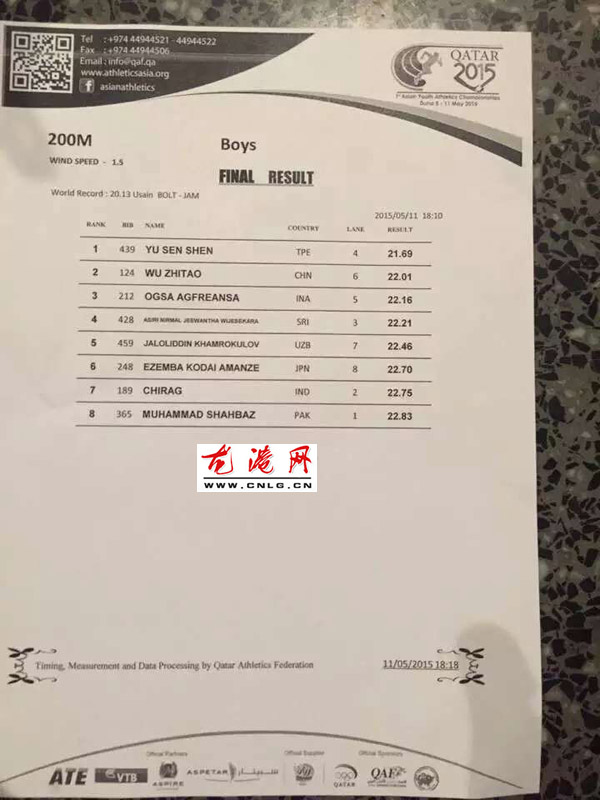 龙港网5月12日快讯:2015年5月12日,亚洲少年田径锦标赛在多哈举行,龙港镇小伙吴志涛代表中国出征,荣获男子200米短跑亚军,成绩是22秒01,希望他再接再厉,今后能取得更加优秀的成绩,为家乡争光。