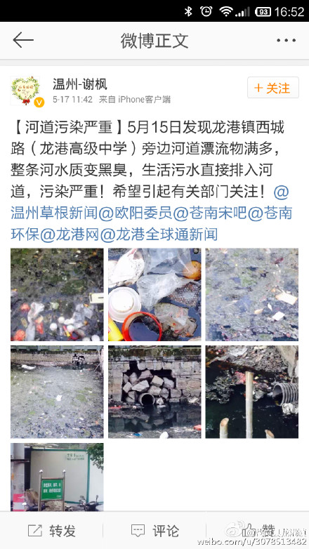 龙港网5月19日讯:近日,网友温州-谢枫在微博爆料称龙港镇西城路(龙港高级中学)旁边发现河道漂流物满多,整条河水质变黑臭,生活污水直接排入河道,污染严重!希望引起有关部门关注!