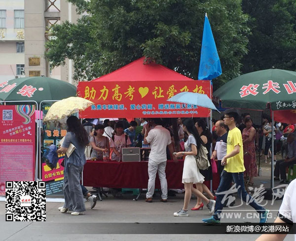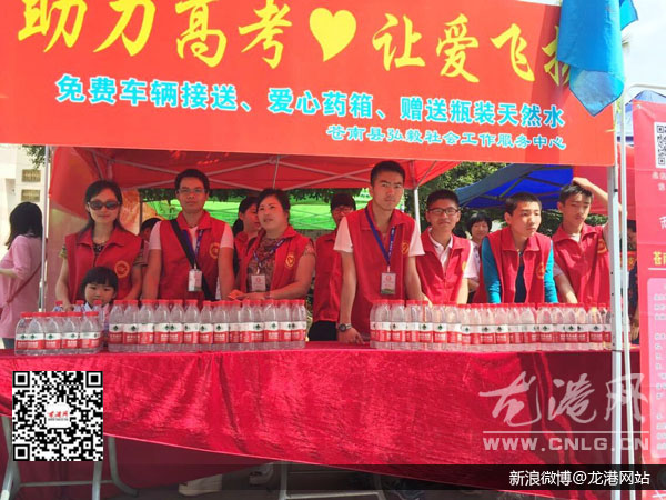 龙港网6月9日讯:2015年的全国高考今日落下帷幕。在高考的三天时间里,龙港镇团委组织弘毅社会工作服务中心、龙港二高义工部和飞龙健身俱乐部志愿者开展了“助力高考•让爱飞扬”主题志愿服务活动。