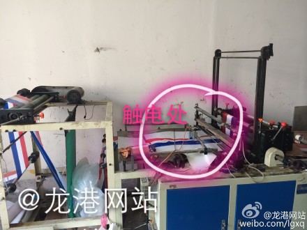 本网编辑第一时间赶到事发现场,仪邦工业区1幢6号2楼生产车间,靠右边是一台加工塑料制袋机器,死者熊某平时就在此操作机器设备。周边一些设备十分简易,严重存在安全隐患,一不小心就会触电。