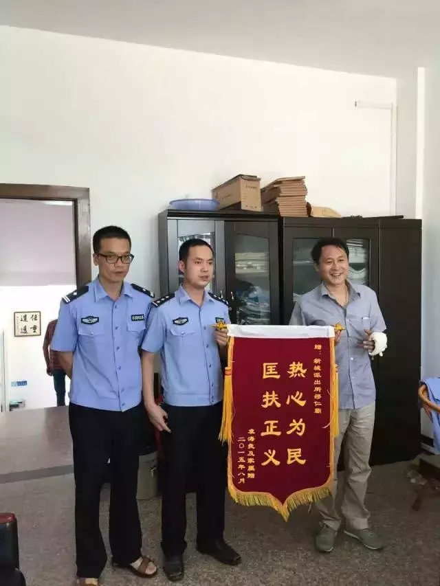 袁先生及其家人根据缪仁霸制服上的警号,多方打听到了新城派出所,送来了锦旗。袁先生紧紧握住缪仁霸的手,连声表示感谢。
