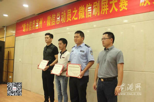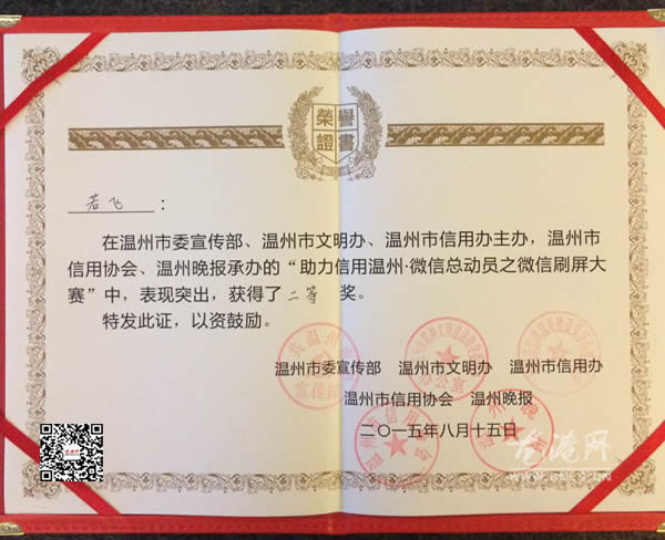 龙港网8月14日讯:今天下午,由市委宣传部、市文明办、市信用办主办的“助力信用温州”微信总动员之刷屏大赛,在温州新城温州晚报大厦3楼会议室举行颁奖仪式,“若飞走监督”平台等荣获市二等奖。