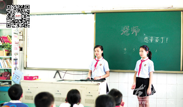 龙港网9月10日讯:今天是我国第31个教师节,龙港第四小学六年(3)班的学生上了一堂别具一格的课。该班的同学与老师互换角色,以“老师,让我替您把课上!”的形式来祝老师节日快乐。