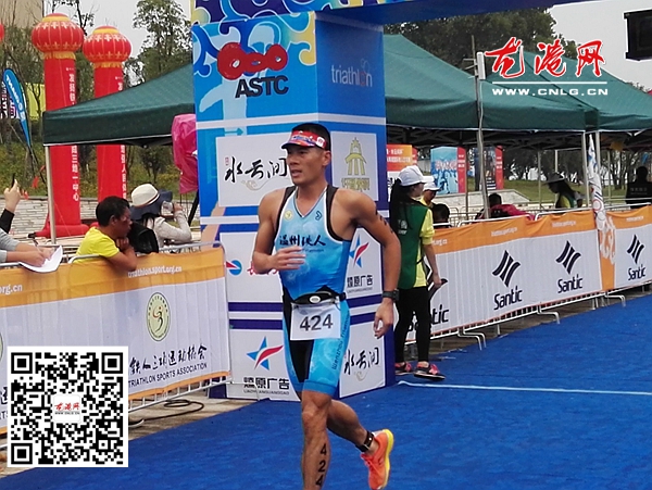 图为龙港铁人三项协会队员黄铨荣冲向终点