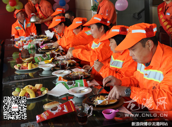 龙港网11月26日讯:今日是感恩节,这个原本属于西方的传统节日,现在被越来越多的中国人提倡。市民买礼物,发短信,送祝福,以各种形式感恩父母、师长、亲朋,以及帮助过自己的人。今天中午,龙港豪客来牛排店邀请了环卫工人到店免费吃一顿自助牛排,向默默奉献、坚守岗位的环卫工人表达感激之情。