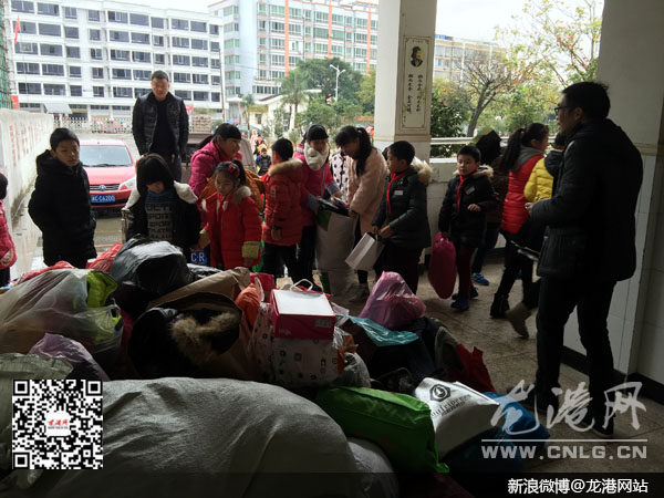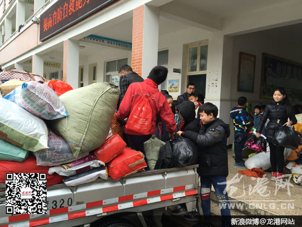 龙港九小热心的老师们闻讯后在第一时间发动全校师生参与。在短短的24小时之内,师生们从家里搬来了用编织袋、大麻袋、纸箱子等装好的衣物摆放在走廊上,堆起了一个小山坡。于是在1月21日上午,蒙蒙细雨、刺骨寒风依然挡不住龙港九小师生们的热情,他们利用课间时间,在校长助理杨宗阔老师的指挥下帮助壹次心志愿者把所有的衣物搬到了大卡车上。