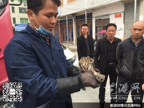 龙港网4月1日讯:今天上午,龙港热心市民黄师傅在港河路附近捉到了一只受伤的鹰鸮,并联系绿眼睛环保组织志愿者,将这只鹰鸮送去救治。
