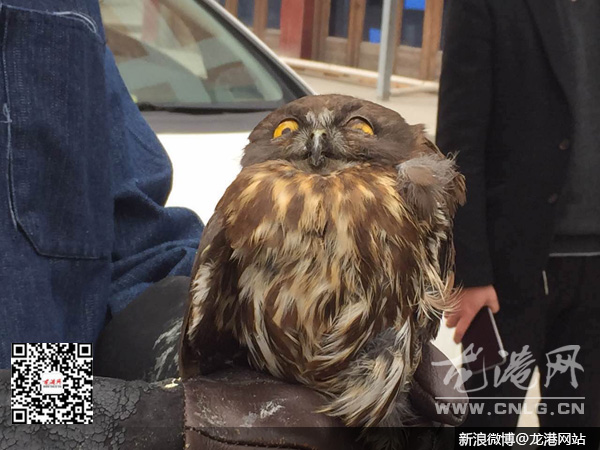 上午8:00多,黄先生从海港路拐进港河路,前方看见一猫头鹰状的动物往路边民房窗玻璃撞去,随后跌落在地。还没等他看个究竟,这家伙再度飞起往玻璃撞去,这下撞的不轻,小家伙倒地后动弹不得。于是,黄先生和周边居民就找了个鸟笼暂时把它安顿好。