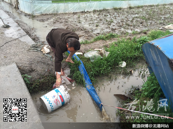记者见到老薛时,他正忙着给秧田排水。这两天龙港连续暴雨,秧田里积压了不少雨水,这让老薛很是着急。据了解,老薛家受淹比较严重的是东侧的5个秧棚,这一片地势相对较低,经过这两天浸泡,棚内部分秧苗开始发黄。西侧秧棚地势稍高,雨水进的少,水已排的差不多。