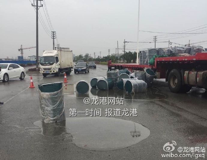 龙港网4月14日讯:昨天下午16时50分,龙港镇世纪大道和西一街路口发生惊险一幕,一满载危化品运输货车与一小车发生刮擦,导致车上30桶聚氨树脂翻落在地,路面粘稠一片。