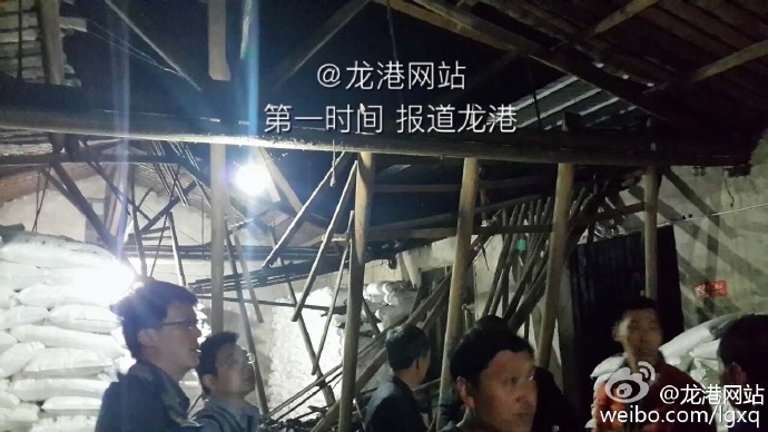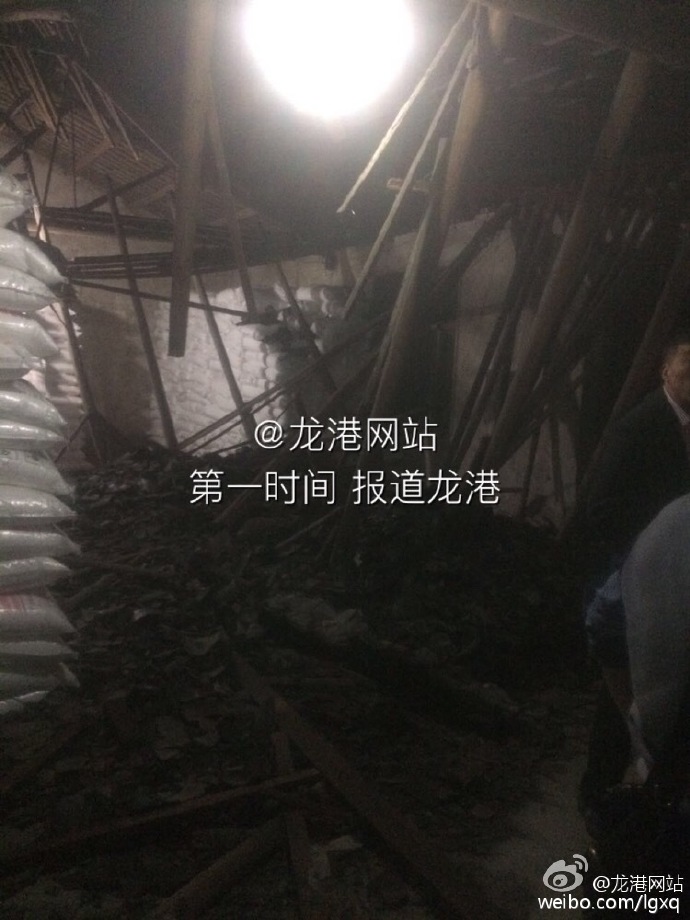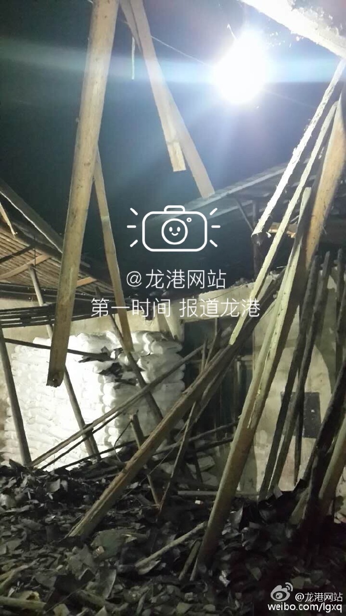 龙港网4月14日简讯:昨天晚上8点许,龙港镇芦浦社区南宕村强达无纺布公司老仓库顶部塌下来,大概面积有五十多平方,所幸无造成人员伤亡,损失也不大。