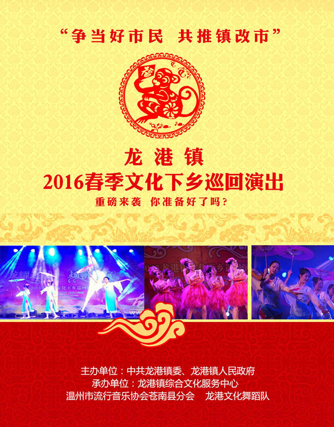 据了解,此次龙港镇2016年春季文化下乡巡回演出由中共龙港镇委、龙港镇人民政府主办,龙港镇综合文化服务中心、温州市流行音乐协会苍南县分会、龙港文化舞蹈队承办,并分别在城南、江浦、城北、龙跃、白沙、湖前、舥艚等社区举办。