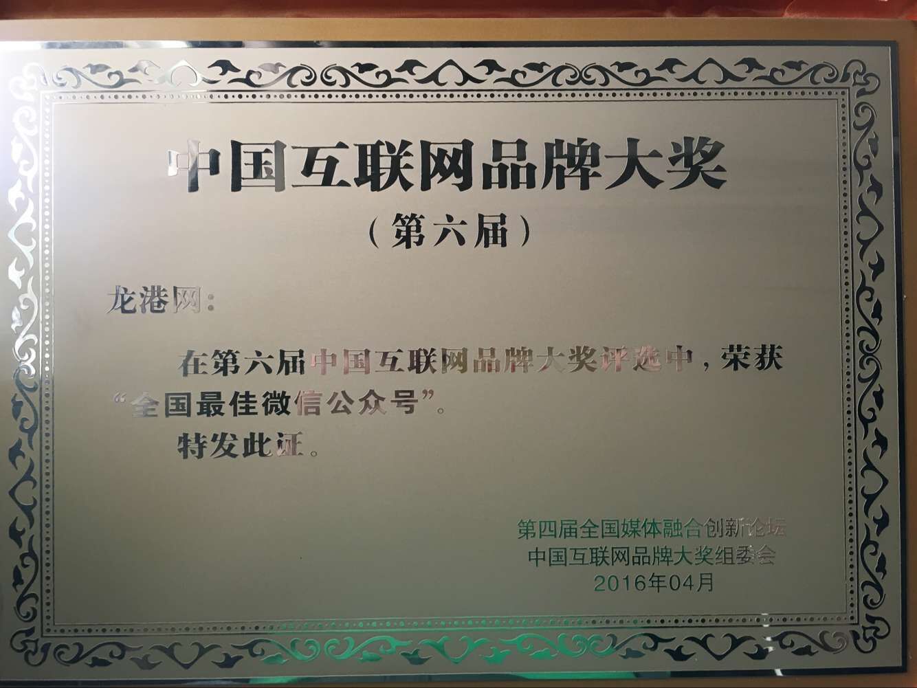 龙港网5月9日讯:日前,第六届“中国互联网品牌大奖”在重庆揭晓,龙港网站微信公众号《龙港网》榜上有名,获得2015~2016年度“全国最佳微信公众号”荣誉称号。来自文化部、国家体育总局、有关宣传部门的领导,全国各地的200多位主流新闻网站的主要负责人、网络宣传主管单位领导、业界专家等将莅临到会。