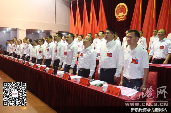 大会会场主席台上方悬挂着“龙港镇第十届人民代表大会第七次会议”的醒目横幅。主席台后方10面鲜艳的红旗簇拥着庄严的国徽。上午9点整,大会在庄严的国歌声正式开幕。苏庆明、丁振俊、陈君恒、上官光强、陈为来、李孝取、金珍敏、丁许远、黄钦放 戴安胡、陈青长、赵凯、黄传朴等领导在主席台前排就座。