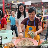 在比赛现场,记者看到,洗净的糯米、蛋黄、粽叶,各种包粽子的材料都已经齐备到位了。按比赛要求,在规定的15分钟时间内,谁包的粽子最多,模样最俊俏,谁就是大赛的冠军。“比赛开始!”随着工作人员一声令下,只见粽叶在选手的指间听话地被卷成漏斗状,装入糯米,再放入蛋黄或肉块后,用剩余的粽叶缠来裹去,再用绳子系好,一个个漂亮的粽子就“应运而生”了。这些选手中既有技术娴熟的大妈,也有手脚麻利的老大爷,大家欢聚一堂,各显才艺,热热闹闹过端午。
