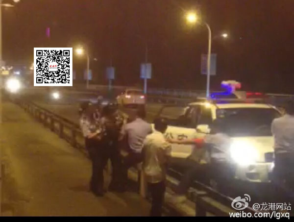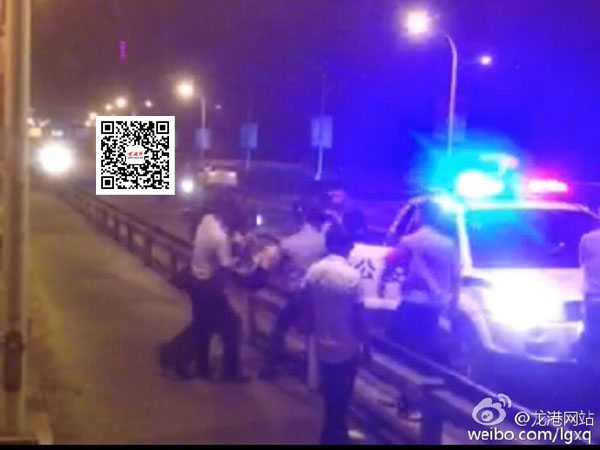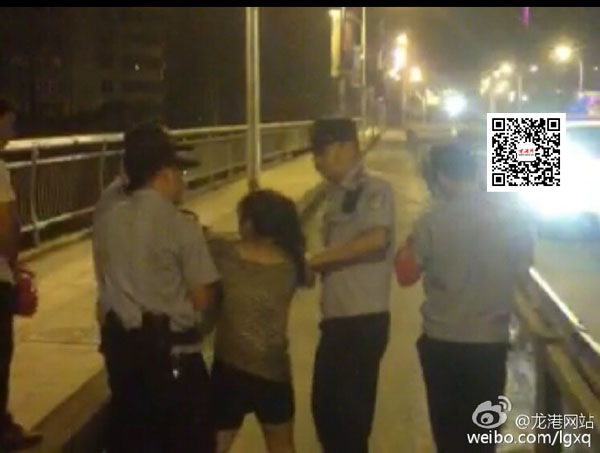 龙港网6月13日快讯:今天凌晨2点许,一中年女子怀疑其丈夫有出轨行为,于是想不开来到瓯南大桥欲跳江自杀,后被路过群众拦下并报警。110民警第一时间赶到,经数十分钟耐心劝说,但该妇女一直不听劝阻,继续反抗。为了防止意外发生,民警采用措施,将此女强制带离现场。