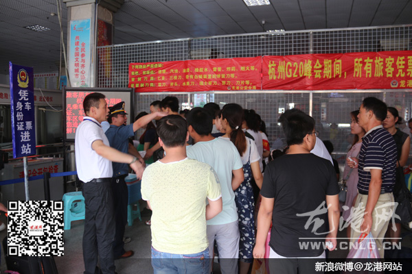 为了做好G20维稳安保工作,龙港车站已全面升级安保措施。继月前实施乘车实名制后。近来,车站加大对开往杭州等方向车次重点检查外,并增派安保人员对进站旅客行包、人身、托运行李的全覆盖安检,杜绝一切违禁品进入候车室上车。