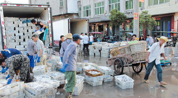 日前,龙港舥艚码头开渔节后第一次出海的船只满载而归。当日下午,舥艚码头上人来车往,一片繁忙景象,一筐筐鲳鱼、小黄鱼、带鱼、鳗鱼等渔获被搬上岸,运往附近的海鲜市场出售。据悉,受今年第17号台风“鲇鱼”影响,我县首批出海的渔船已陆续返航,各种鲜活的海产品将大量上市,市民可以尽情享用。(周元斌/摄)