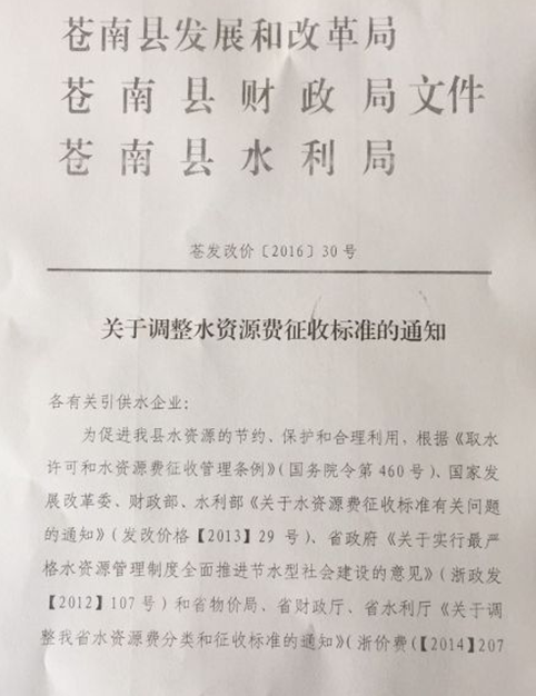 为促进我县水资源的节约、保护和合理利用,根据《取水许可和水资源费征收管理条例》(国务院令第460号)、国家发展改革委、财政部、水利部《关于水资源费征收标准有关问题的通知》(发改价格【2013】29号)、省政府《关于实行最严格水资源管理制度全面推进节水型社会建设的意见》(浙政发【2012】107号)、省物价局、省财政厅、省水利厅《关于调整我省水资源费分类和征收标准的通知》(浙价费(【2014】207号)和县发展和改革局、县财政局、县水利局《关于调整水资源费征收标准的通知》(苍发改价【2016】30号)等有关规定,供水企业原交纳的水资源费由现行0.08元/立方米调整为0.20元/立方米,用户自来水到户价格在现行价格基础上加收0.15元/立方米,苍南县各城镇供水企业俱已于12月前执行该收费标准。