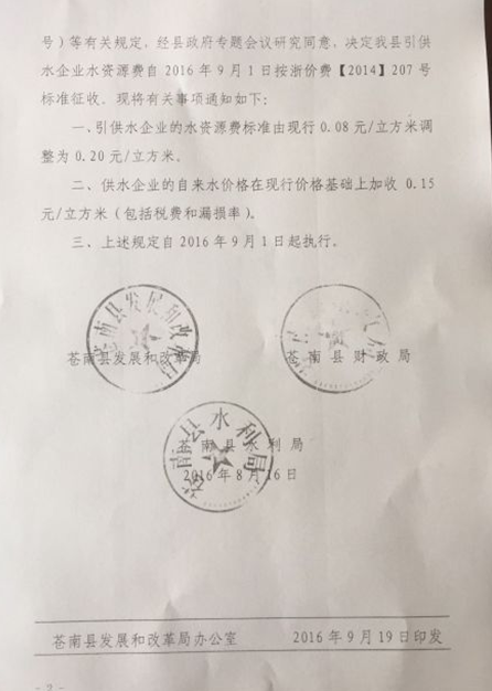 附:《关于调整水资源费征收标准的通知》苍发改价【2016】30号