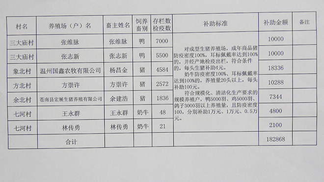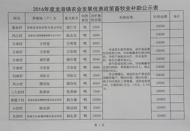 2016年龙港镇农业发展优惠政策畜牧业补助公示