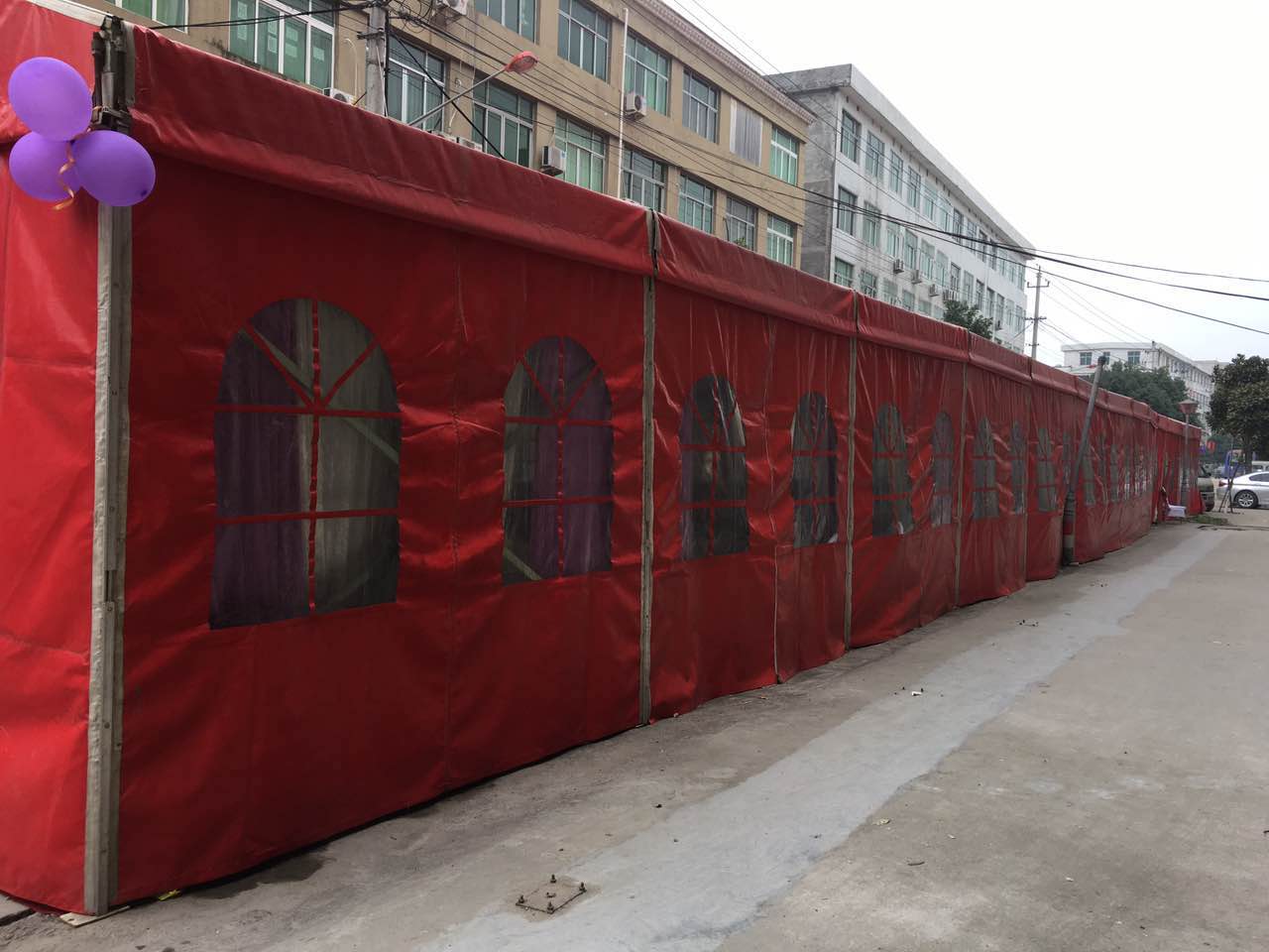 龙港网1月31日讯:昨天下午6点许,龙港镇舥艚社区兴港路主干道几乎“瘫痪”,原因是6米宽的兴港路被临时搭起的红色大铁棚占去了,导致车辆无法通行。村民吕某称,由于一村民儿子明天要结婚,一直预订不到酒店,一家平阳某婚庆公司才出此下策,在路边临时搭起这个大棚。
