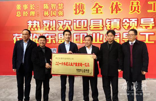 县领导黄荣定、苏庆明、黄锦耀、陈为来、冯兴钱等一行,在县相关部门负责人和镇领导陈显宏、朱文胜陪同下,先后走访了2016年度工业产值首超亿元的金燕印业、东盟印业、新雅包装、巨诚印业、金沙江实业、世博新材料和2016年产值首超3亿元的温州联益线束胶粘有限公司,分别为企业授牌匾,并送上了新春祝福。
