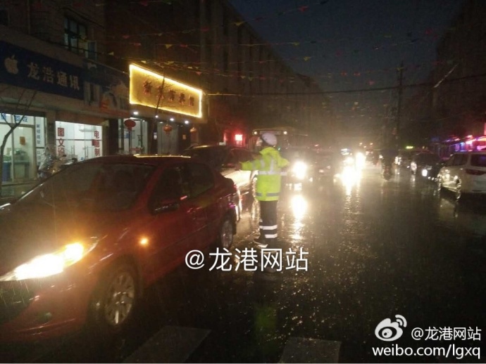 龙港网2月22日讯:今晚,忽如其来的一场雨给龙港的市民来个措手不及,同时伴随大风,气温也骤降,在这寒冷的夜晚,龙港通港路福园酒店前的一幕却充满了温情:一名女子被车撞倒受伤,正在路面巡逻的苍南县公安局龙港交警队2名协警发现后,立即向指挥中心报告,协警赵加珍上前为伤者撑伞遮风挡雨达半个小时,直到救护车赶到。另一名协警在现场疏导指挥,很快恢复了交通秩序。