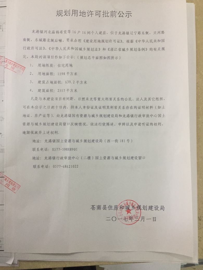 龙港镇河北庙韩希党等16户16间个人建房公示