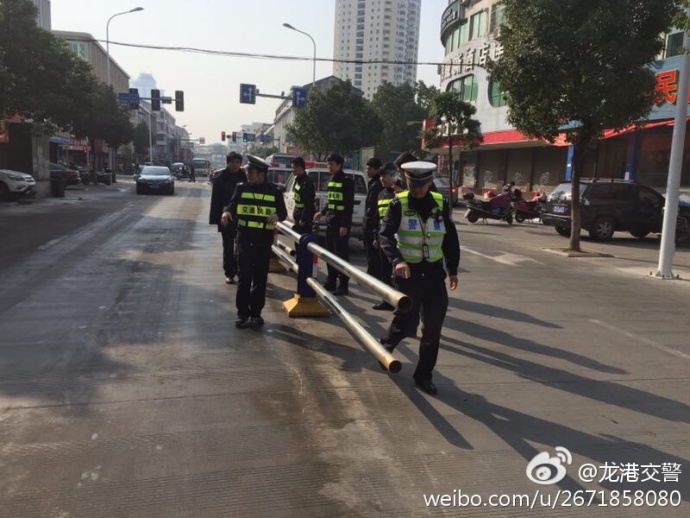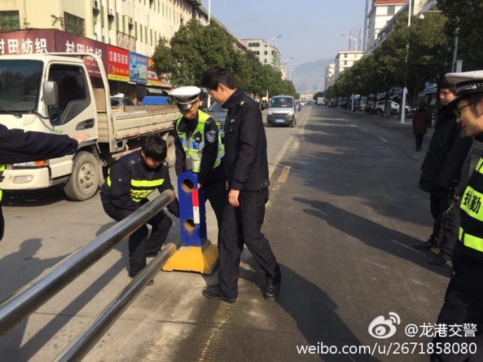 龙港网3月1日简讯:昨夜,人民路一处隔离栏杆被车辆撞坏,支撑石墩被撞出十米开外,龙港交警队城区巡逻组发现后,立即下车,众人合力,将其恢复。
