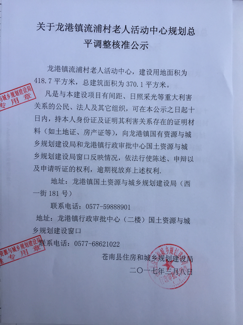 龙港镇流浦村老人活动中心规划总平核准公示