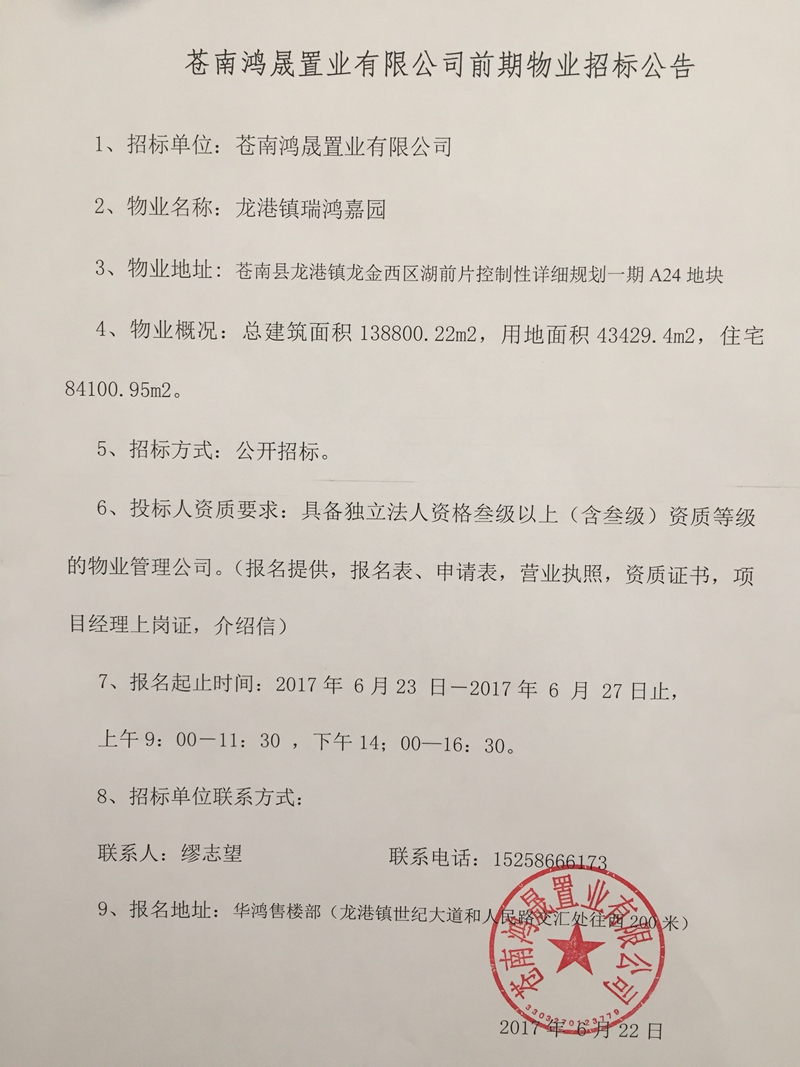 苍南鸿晟置业有限公司招标公告