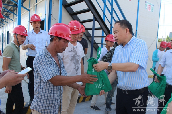 今天下午,县委常委、龙港镇委书记陈为来率镇委副书记丁云勇、副镇长朱文胜、章定宇、胡碧群等人到龙凤河清淤工地、楼李河截污纳管工地、金池、诚德工地、新龙港高级中学、华鸿房开、高速复线特大桥、环卫站等地,分别慰问了清淤工人、建筑工人、环卫工等坚守工作岗位为城市建设添砖加瓦的劳动者。慰问组为一线职工送上西瓜、矿泉水、花露水、防暑降温药品等夏令用品,给他们送上了夏日的清凉,也送去了党和政府的关怀。每到一处,陈为来都与坚守一线的工作人员亲切交谈,嘱咐他们在高温作业时要注意自身安全,注意休息等安全事项。