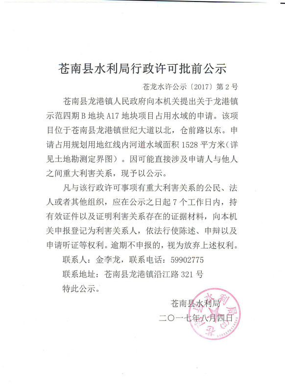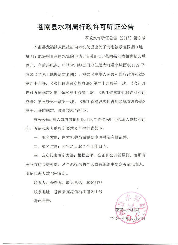 苍南县水利局行政许可听证公告等