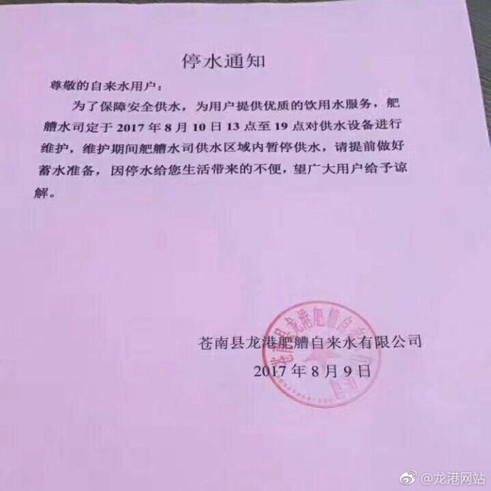 【舥艚临时停水通知】O8月10日13:00一19:00因设备维护 ,要临时停水,特此通知。