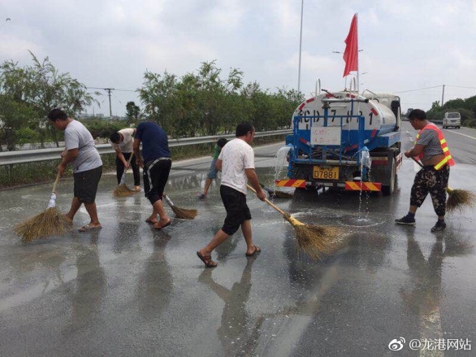 龙港是我家,环境卫生靠大家,为喜迎国庆、中秋双节来临之际。9月24日,龙港飞龙、宏翔、华顺、瑞格和尊龙公司等五家渣土运输企业,自行组织洒水车五辆、员工70余名,到灵海大道和时代大道进行路面清扫、保洁工作,为龙港市民节日出行提供方便。