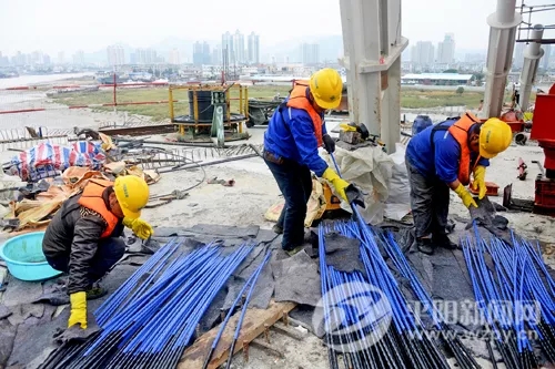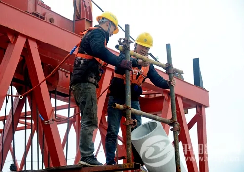 12月15日,记者在鳌江四桥施工现场看到,桥梁底下加满了盘扣支架,施工人员正在对引桥桥面进行混泥土梁浇筑。同时,主桥的部分也在进行最后的钢梁吊装、焊接。据现场施工人员介绍,目前该桥主塔已全面竣工,只剩引桥桥面的浇筑和主桥的吊装,整座大桥预计于2018年5月全面竣工,8月份投入使用。