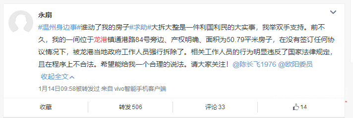 龙港网经核实,龙港镇江口A-01地块已列为省棚户区改造项目。通港路84号属于A-01地块,业主为戴某,已选择货币补偿,补偿安置款已全部支付给业主。而微博中所提到“通港路84号旁边、产权明确房子”为通港路84号附属用房,为未登记建筑,属于违章建筑,已按县政府相关文件规定拟给予处置。但戴某本人一定要按一整间标准补偿,在多次通知业主来办理结算手续,业主一直不配合,龙港镇政府根据苍南县政府相关文件精神对江口A-01地块内通港路84号旁建筑物依法依规进行处理。