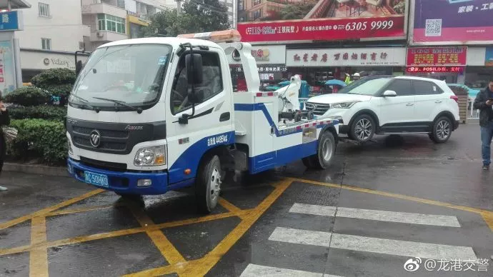 网格线上霸道停车影响公交车出入 交警果断将其拖移