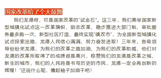 我们龙港呀,虽然被人比喻为“千城一面”,到处是城中村,但是去年龙港打了一个翻身战,借助全市推进城中村改造的有力时机,一举拿下11个村的拆迁任务,今年将全面破土建设,补足龙港城市面貌短板。去年,龙港城市公园的建成,着实让大家雀跃,大大提升了龙港城市形象,这三年,公园一号、中梁半岛、中梁华府、华鸿中央公园、中央原墅、东方世贸广场、国悦府、龙金首府等一批现代化小区相继拔地而起,在改善龙港人居环境的同时,也让龙港世纪新城向我们走来。我说在外的龙港亲人们,你回家到世纪新城看看吧!