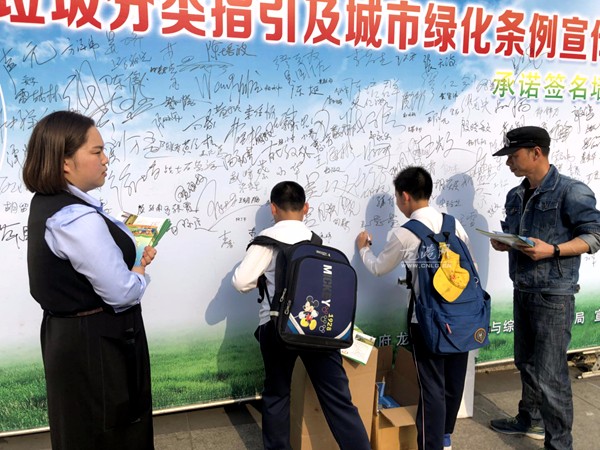 下午,执法局缪克权局长组织执法队员,在财富广场设万人签名墙进行现场宣传,镇委陈为来书记率领导班子亲自到现场支持宣传活动。活动现场,执法队员和网民监督团成员向居民发放《浙江省城镇生活垃圾分类管理办法》和《温州市城市绿化条例》宣传手册,并让居民在“参与垃圾革命承诺书”上签名。每个来了解城市绿化和垃圾分类知识的居民,都可以得到一个印有垃圾分类和城市绿化宣传标语的实用水杯。