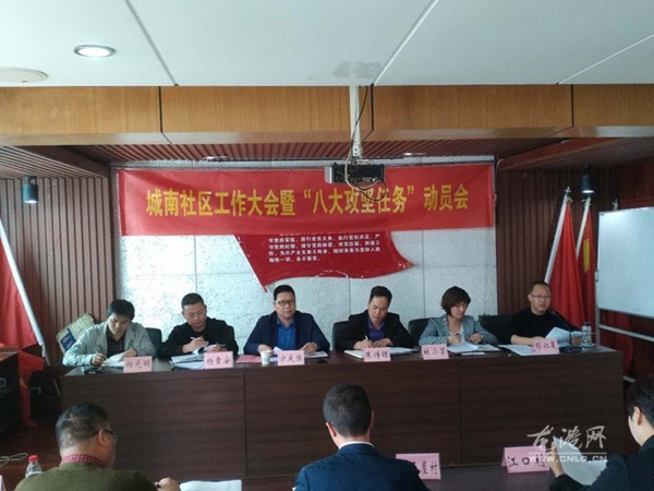 城南社区全体工作人员及村居两委干部,在江浦居5楼党员活动室召开”城南社区工作大会暨八大攻坚任务动员会”。会上布置了垃圾革命,安全消防,征兵,组织等工作,社区方庆涨书记,重点强调了”八大攻坚任务”和村级基层党建五个八标准建设。