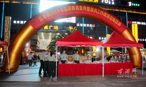 昨晚,龙港镇在财富广场开展2018年国防教育宣传暨征兵工作政策咨询活动,进一步营造征兵工作氛围,提高全社会对征兵政策的知晓率,进而鼓励和动员广大适龄青年踊跃报名参军。镇委委员、人武部部长蔡开义,副镇长林大阔参加活动。