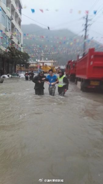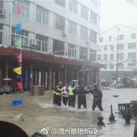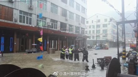 受台风“玛莉亚”影响,苍南县龙港镇巴曹社区出现内涝,水位不断上涨。早上6时,龙港镇武装部组织民兵应急排正在紧急转移受困群众。