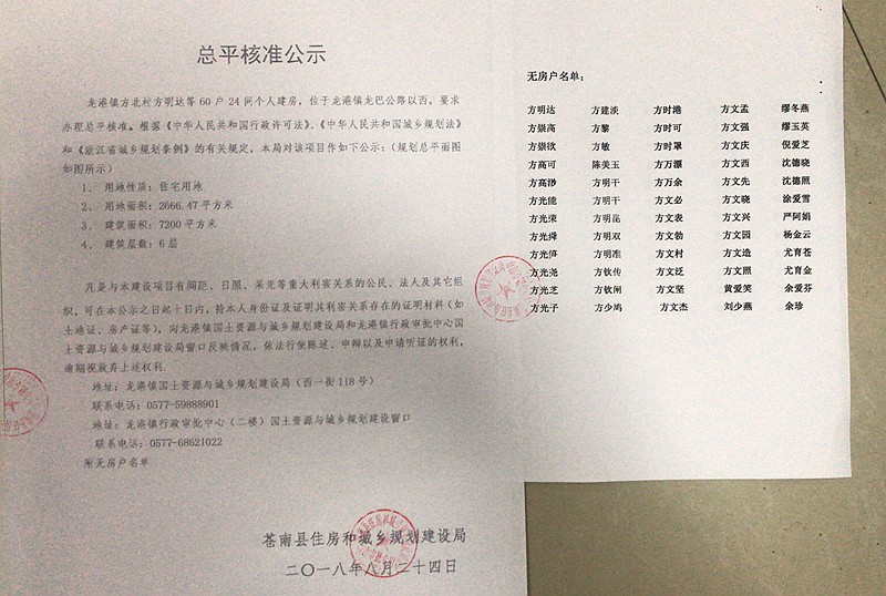 龙港镇方北村方明达等60户24间个人建房,位于龙港镇龙巴公路以西,要求办理总平核准。根据《中华人民共和国行政许可法》、《中华人民共和国城乡规划法》和《浙江省城乡规划条例》的有关规定,本局对该项目作如下公示:(规划总平面图如图所示)