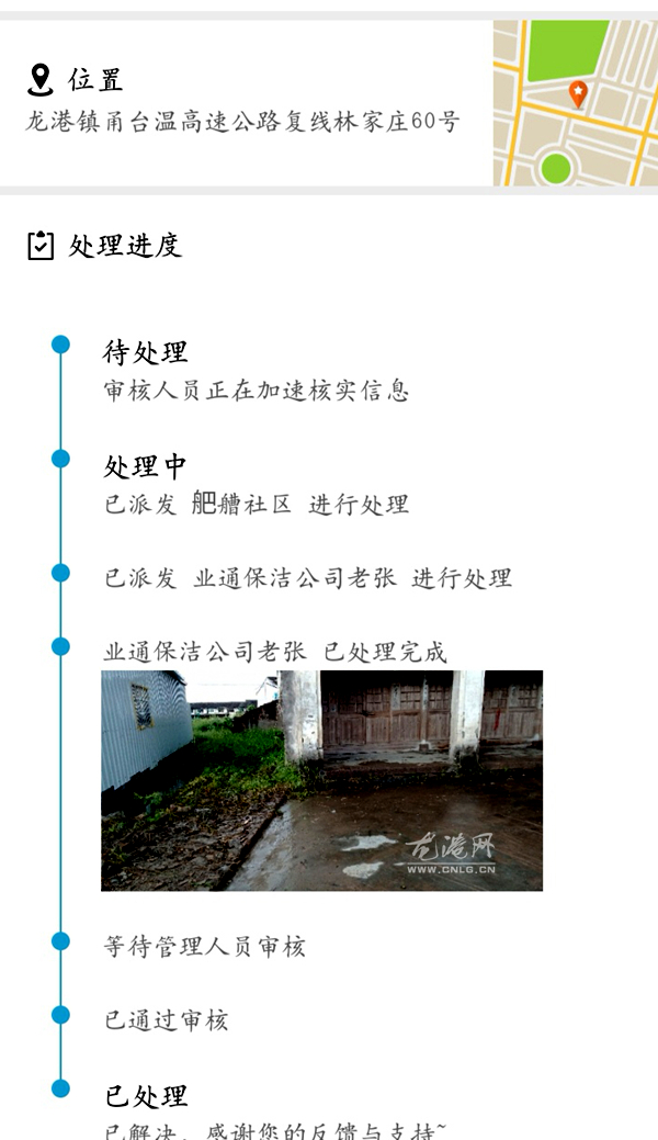 会议指出,“随手拍”起到了实现优质保洁、引导群众监督以及提高问题处置效率的作用。龙港镇投入5万多元搭建了“随手拍”系统平台,准确影像资料能通过微信平台,以快捷的方式与相关部门进行互动交流,进一步延伸监管触角,实现保洁全覆盖。